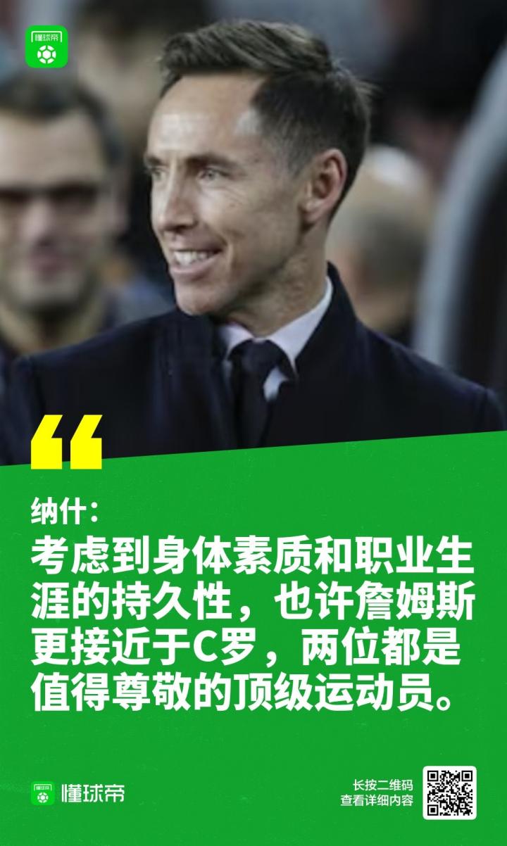 纳什还谈到了C罗和詹姆斯之间的对比:“詹姆斯和C罗都是顶尖运动员,都在技术和身体素质方面展现了无可比拟的能力。”他分析说,虽然C罗更像詹姆斯,但两人都是无可替代的领袖。